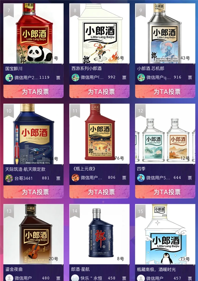 截至目前,大赛已收到近百份精心打磨的创意投稿,累计收获超 26000 次点赞,充分展现出大众对小郎酒品牌年轻化、艺术化探索的高度认可与热情支持。小郎酒以方寸瓶身为画布,邀请全民共同执笔,将传统白酒文化与现代设计美学相融,让每一瓶小郎酒成为可触摸、可传播、可收藏的 “流动美术馆”。